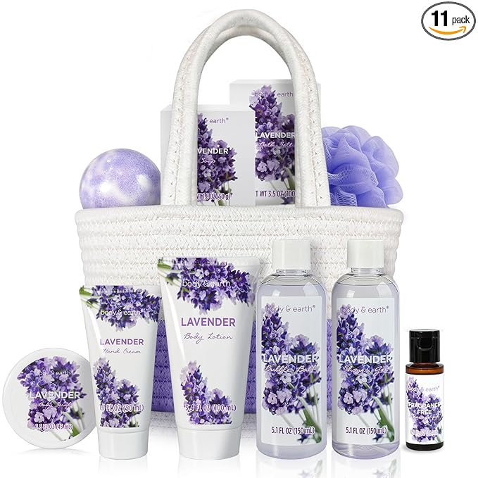 Cestas de regalo de spa para mujer, cuerpo y tierra, 11 piezas, juegos de regalo de lavanda con baño de burbujas, gel de ducha, loción corporal, regalos de cumpleaños para mujeres,